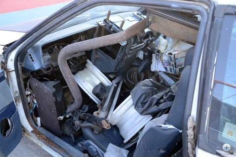 Egyelőre ugyanis nem sikerült beindítani, bár Karotta elmondása szerint alig valamivel több mint 100 ezer kilométer van a motorjában. Ez lehet akár így is, de fene tudja, milyen állapotban van, lehet csapágyas, hengerfejes, a motor állapota dönti el, hogy érdemes-e vele tovább foglalkoznunk, de nagyon bánnánk, ha kezdeti lendületünk máris megtörne, hiszen nagyon megszerettük ezt a romhalmazt.