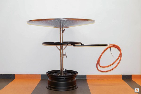 Döbbenten álltunk, és még döbbentebben cipeltük fel a cuccot. Aztán leesett, hogy ez egy tárcsa. Illetve egy sütögető tárcsa, deluxe kivitelben, porfestett GM felni alappal, egyedi kivitelezésben. És kérem, az a tárcsa nem forgatta soha a tehéntrágyát a termőföldbe, ez biztos. Péter ugyanis úgy tűnik, maga alkotta a tárcsát, rozsdamentes acéllemezből és ahogy Bandi mondaná, könnyfakasztóan jó minőségben.
