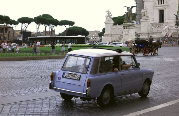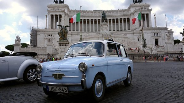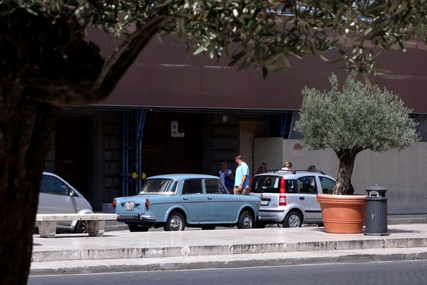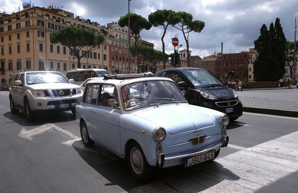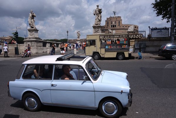 Rómában a másik nagy probléma az lett, hogy felfigyeltek ránk a helyiek és a turisták. Hol egy taxis szorított ki egy útszűkületnél, hogy elmagyarázza, milyen rég látott errefelé ilyen autót, hol egy amerikai turista készített iPaddel képeket, amíg az Angyalvár mellett fotózkodtunk, hol az idegenvezető nő hagyta ott a csoportját a Trevi-kútnál, hogy hüledezzen egy kicsit, honnan jöttünk ezzel a csöppséggel, majd ő is ránk lőtt párat. De ennél sokkal több volt az incidens, nem beszélve azokról, akiknek meg se álltunk. Tetszett nekik az autó, ennek meg én persze örültem, mert talán vissza tudtam neki adni a hatvanas évekbeli Róma egy foltnyi hangulatát.