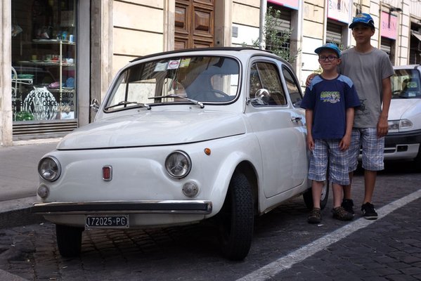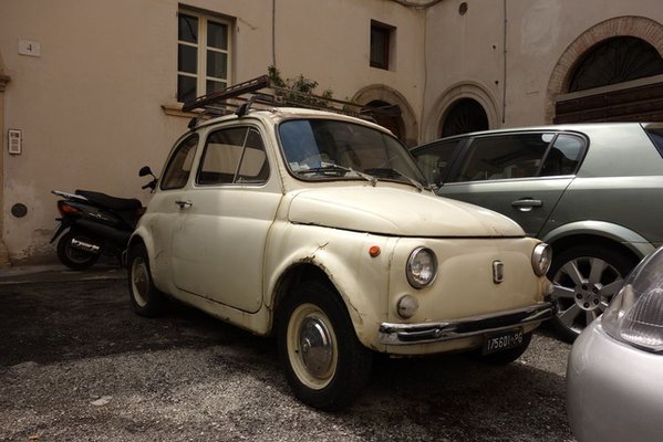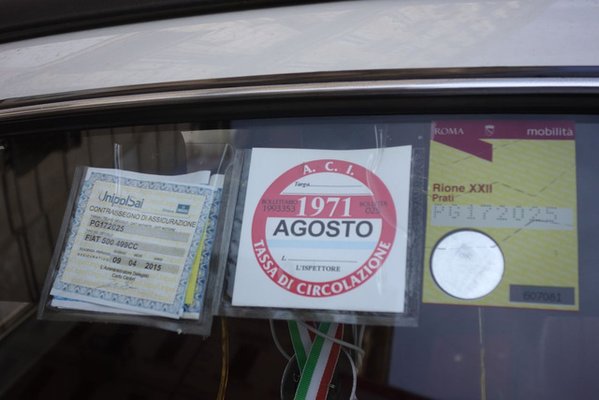 A Spanyol lépcső felé vezető metrót keresve belebonyolódtunk egy kis ruhavásárlásba, majd rögtön utána egy perugiai Fiat 500 L-be, amin amellett, hogy nem rá való kerekek voltak (Fiat 126, illetve a Fiat 500 R-en voltak ilyenek), a római behajtási engedély mellett veteránigazolás is virított – végre szemügyre vehettem egy ilyen plecsnit.