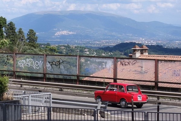 Nekem ez a terület azért is kedves, mert itt láthatóan jobban szeretik az öreg autókat, mint utunk eddigi részein. Perugiában három másik 500-as Fiatot is láttam mozogni, a Gubbio felé vezető úton pedig sokkal több „thumbs up!” dudálást kaptunk, mint eddig bármikor, szinte már zavaró volt.