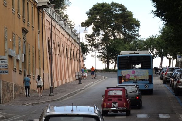 Itt láttuk meg utunk eddigi első, az utcán menő Bianchináját (érdekes, a későbbi A112-ből egy szálat nem láttam, még ledobva sem), egy piros Quattropostit (a limuzin), olyat, mint amilyet Fantozzi is használt. Persze a nagy izgalomban nem bírtam elég gyorsan előrántani a gépet, csak integettem és kurjongattam a csávónak, aki egy, az enyéimhez hasonló gyerekkel a jobb egyen elhúzott mellettünk. Hátulról azért elkaptam, egy fotó, ez is több mint a semmi.