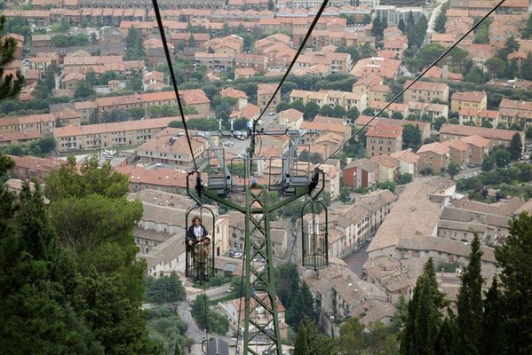 Végre elmentünk a város végébe is, ahol kosaras libegő visz fel San Ubaldo templomához. Sokkal meredekebben emelkedik és a kosaras megoldás miatt sokkal ijesztőbb a mi Hárs-hegyi beülősünknél, pláne, hogy lent Gubbio figyel. A templomban ott a három üreges, egyenként 300 kilós fa izé (Cesi), amiket évente egyszer, május 15-én a hívők bevadult csoportja felcipel ide, a hegyre. El se tudom képzelni, hogyan, iszonyú meredek az egész.