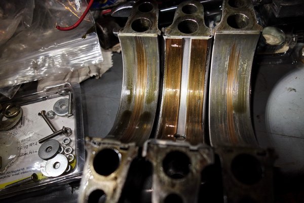 Ha már úgyis ránk sötétedett, és Sipi már úgyis elcseszte az egész napját, nekiálltam szétszedni a blokk maradékát. Gyanús állapotú hajtókar-csapágyak. Még gyanúsabb fekvőcsapágy-felek, ó jaj, ezeken már nincs is fehér fém.
