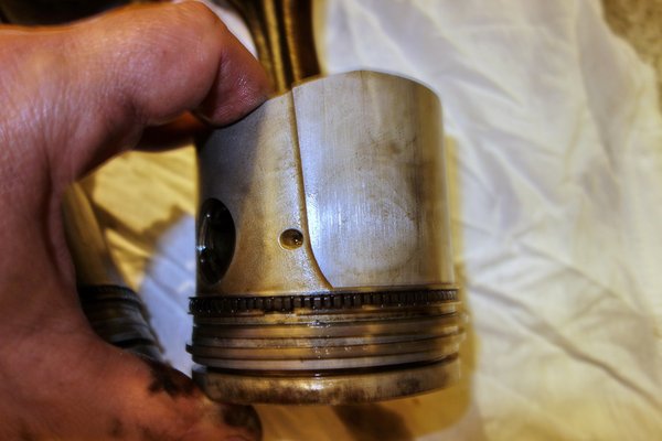 Kitoltam felfelé a dugattyúkat. Eddig halkan abban reménykedtem, hogy egy kis fúrással, alapméretre visszahüvelyezve az eredeti dugókkal és valami odavaló gyűrűkkel menthető lesz a motor. De két dugattyúról is törötten estek le a kompressziógyűrűk, erősen meglógósodott egyéb gyűrűket találtam a többi helyen. Aha, ezek pumpálták fel az olajat, ettől volt olyan rettentő büdös a kipufogógáz.