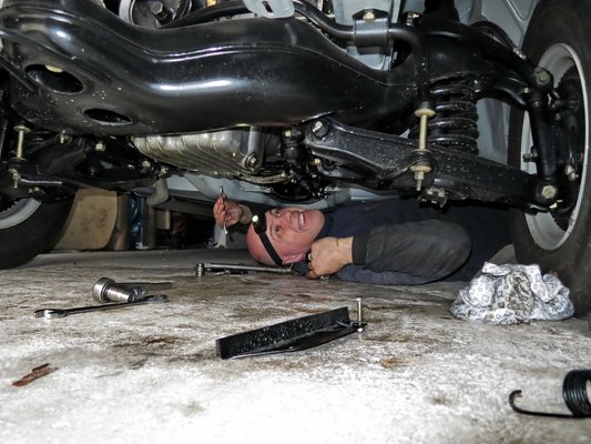 Vissza az autó alá, már látom, hű, ez baromira elakad. Már értem is, miért ment ez a művelet állványon, miért nem megy most: a teknőt annyira el kéne húzni oldalra, amit itt a lengőkar-állvány rész nem enged a bölcsőn. Túl keskeny a hely. Igen ám, de mi lenne, ha kicsit elemelkedne a blokk, akkor talán épp kiférne a stift mellett a teknő...