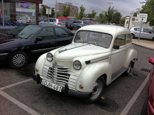 Ez, kérem tisztelettel, egy Opel Olympia. Nem egy megóvott veterán, hanem egy mindennap, autóként használt öreg Opel. Ami úgy tűnik, tényleg elég kopásálló – meg igen, de el nem kopott. Oké, a fenekét kicsit átrajzoltákm ahogy elnézem, a púpos Waresz csomagtérfedelét faraghatták rá.