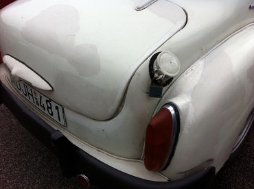 Az ember gyanútlanul Tescóba megy, hogy kutyatápot vegyen, erre ez a fenék gömbölyödik az orra előtt. És néz, de nagyon bután: ez meg mi a jó franc? A lámpát ismerem, púpos Wartburg, meg Barkas hátuljára szerelték ezt a formát (de a kettő nem egyforma, az egyiken felül van az index, a másikon alul, de fejből már meg nem mondom, melyik-melyik). De ilyen csomagtartót még életemben nem láttam. Vagy esetleg lengyel Syrena? Nem, nem, nem. Kipattanok a kocsiból, körbejárom a gépet, és már mindent értek.