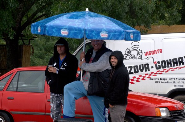 Az esőt szeretjük, az eső jó. Mert ilyenkor elég a lóerő, nem fogy se a gumi, se a technika, ráadásul csak az jön, aki érzi, aki nem ijedős. A visontai gokartpálya vezetéstechnikailag így is kihívás nekünk, de ilyenkor a vézna, de lelkes kis szívó 1,6-os motorunkkal is kiadja néha már egy-két kombináció is egymás után. A Hacsinkat Pista már dicsérte eleget, én most egy kicsit örülnék a többieknek.