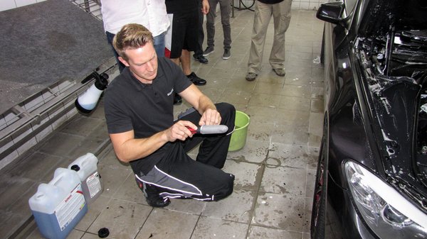 Igen, az igazán gyakorlott, profi szakember simán nekiugrik a falcoknak a nagynyomásúval, csak biztos kéz és jó gép kell hozzá, ideális esetben változtatható nyomású lándzsával. A szilikonos vízlehúzó maga sem újdonság, a használata nem pláne nem okozott meglepetést a közönségnek. Amíg a kocsi a letörölgetés után száradt, a belsejével is elkezdtek foglalkozni. Itt már több olyan fogást használt Christian Resch, ami nem volt mindenkinek ismerős. A Tornador fantázianevű szerkezetet nem mindenhol használják, igazán érdekesen működő cucc. Egyszerre porlasztja a tisztítószert nagy nyomással a koszos kárpitanyagra, rántja ki a a koszt a szövetből és szárít.