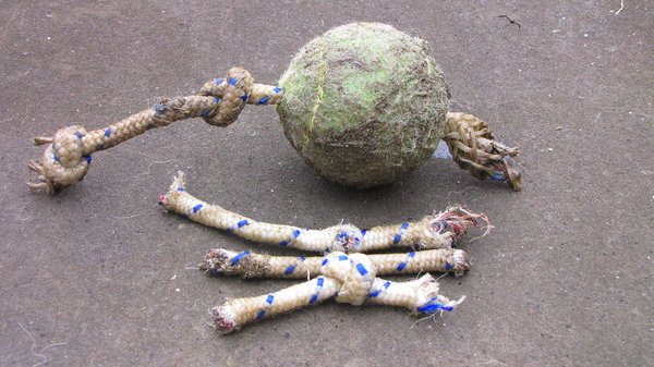 Hétfőn két új rágni való játékkal is készültem. Egyet én csináltam a kis kezeimmel: egy már használt teniszlabdát fűztem fel erős kötélre. Vért izzadtam, mire befűztem a kilyukasztott labdába a kötelet, majd csomót kötöttem rá, hogy biztosan ne tudja Jancsika kirángatni a lasztiból. Ezután az történt, hogy Jánosból kibújt a matek-zseni, és három, közel egyforma hosszú darabra harapta a mindennek ellenálló kötelet. Majd a lyukon, amibe alig bírtam befűzni, átrángatta a vastag csomót, így most egy oldalon van a két csomó. Azóta kevésbé érdekli, mission accomplished, új feladat kell.