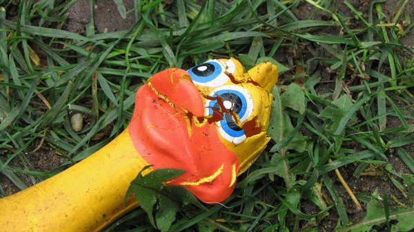 Lidlben vettem az akciós kutyás cuccokból egy ülés-/csomagtér-takarót, meg egy csinos gumikacsát. Nyekereg-hápog, élénk színe van, Jancsi megkészült a boldogságtól, extázisban, csillogó szemekkel kezdte kergetni. Féltünk, hogy mi is megkészülünk majd a folyamatos gumikacsa-sípolástól, de úgy 40 perc után csend lett. A kacsa elnémult. Örökre.