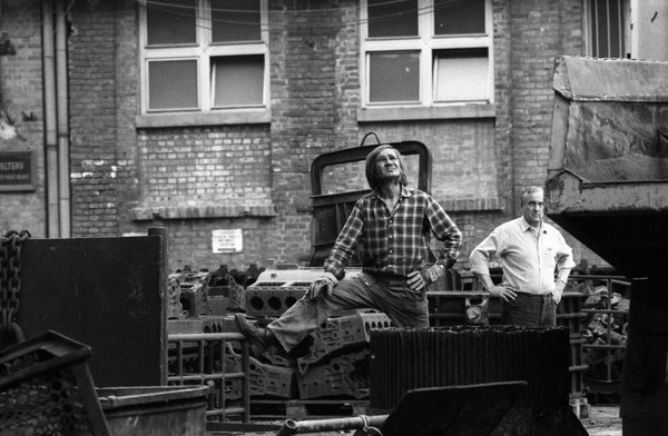 1990-ben a korábban szocialista rendszerben termelő cégek hirtelen már csak a piacgazdasági körülmények között értékesíthették a termékeiket. Volt is belőle baj, rengeteg, sok termék és szolgáltatás már nem ütötte meg a piacon elvárt szintet. Ez a kép elég sokat elmond arról, miért nem voltak versenyképesek a szocialista gyárak a kapitalista világban. Egy öntöde udvarán hathengeres motorblokkok nyers öntvényei egymásra stócolva várnak a sorsukra. Talán Rábákhoz vagy Ikarusokhoz készültek, a fene tudja, hol. De az látszik, hogy lepattant a gyár, lepattant a melós is, aki koszos, szakadt ruhában támasztja a korlátot. Az egész udvar mocskos, rozsdapor lepi, a mindenféle kaloda nélkül egymásra dobált blokkokon már látszik, egy ideje a szabadban állnak, a víz már jól látható csíkokat festett a rozsdás vasdarabokra. Érdekes lenne tudni, ez az öntöde a következő évek zavaros viszonyait hogyan vészelte át, vajon meddig készültek itt teherautó alkatrészek?