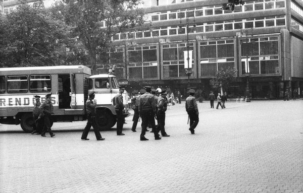 IFA rendőrségi csapatszállító a Vörösmarty téren. Hány, de hány politikai demonstrációt, focimeccset és a fene tudja milyen tömegrendezvényt csinálhatott azóta végig ez az IFA. Hiszen pár éve még biztosan használtak ilyeneket, talán még pont ezt a példányt is. Hogy a Policecars.hu -n látható IFA csapatszállítók közül pontosan melyik lehet ez a kocsi, nem tudom, sok egyedi ismertetőjelet nem látok rajtuk. Persze modernizáltak ám rajtuk, a régi Villtesz villogókat modernebb Hellákra cserélték, de gondolom, annak is már bő tíz éve.