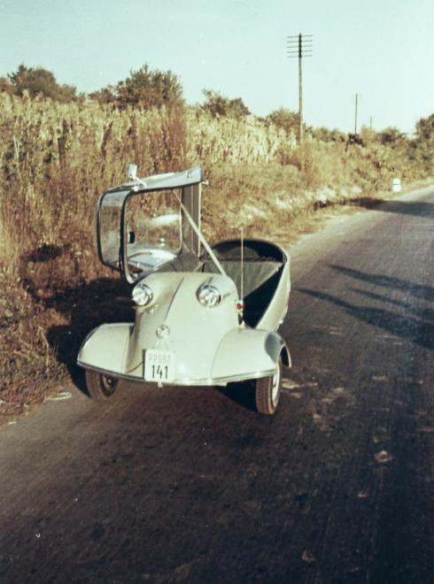 Ötvenhatról mindenkinek a forradalom képei jutnak eszébe, a Fortepanon is találni szép számmal, de én inkább most egy könnyedebbet választottam. Egy vidám kis Messerschmitt Kabinenrollert látunk a képen, valahol vidéken. Az első gondolat, ami eszembe jut a kép láttán, hogy lejárt próbarendszám ! Hány, de hány cikk vagy poszt kommentjében olvastam ezeket a szavakat... De hagyjuk a hülyéskedést, inkább próbáljuk meg elképzelni, mennyire furcsán nézhetett ki egy ilyen plexibuborékos aszfaltpattanás a magyar utcákon. Szerintem egy La Ferrari után nem fordulnak meg ma annyian, mint 56-ban a kis KR után. És hogy mit keresett ez a mikroautó nálunk? Csak tippelni tudok: szerintem a honi törpeautó tervezők tesztelhették, hogy így jussanak minél több információhoz. Amiket aztán sosem használhattak fel úgy, ahogy szerették volna, mert a magyar törpeautó-gyártás mintadarabok szintjén rekedt.