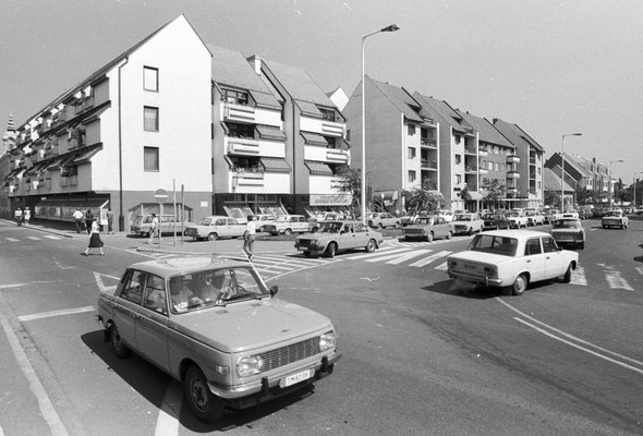 Ez egy egészen különleges felvétel. Nem a környék miatt, a győri Pálffy és Teleki László utca sarka, ahogy a google mapsen elnézem, nem sokat változott az elmúlt 28 évben. Bár az útburkolat más – a térkő lobbi itt is jól működött –, de nem ezért nehéz azonnal felismerni a környéket. A 87-ben még csak vézna csemetékből terebélyes lombú fasor lett, ezek takarják a házakat. A különlegesség a képen látható autó állomány összetétele. Én bizony egyetlen egy nem szockó kocsit nem látok a képen, csak Wartburg, Trabant, Škoda meg Lada, ameddig az objektív ellát. Ennyire homogén keleti autós utcaképet ezután már soha többet nem lehetett készíteni. 1988-ban megkönnyítették az autóbehozatalt, így nagyon sokan valóra váltották régi álmukat: metál fényezésű, a KGST-ből származóknál fényévekkel modernebb nyugati autót vettek. Ezek után kezdődött el a magyarországi utcák, parkolók képének teljes átalakulása. Ma majdnem olyan kerek szemel néznek meg az emberek egy króm lökhárítós Wartburgot, egy szép ezerkettes Ladát, mint akkoriban egy ezüst-metál Mercedes-t.