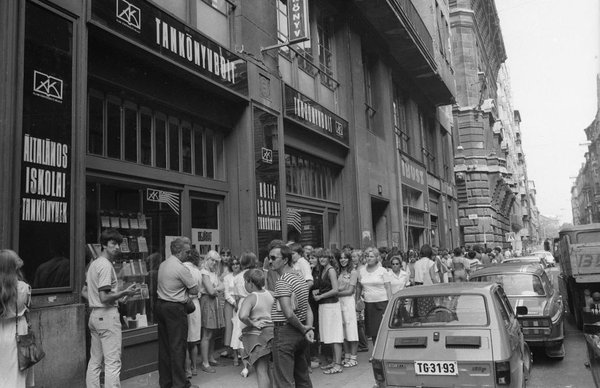 Ez a fotó is gyönyörűen példázza, mi volt nálunk az autós valóság, abban az időben, amikor nyugaton az emberek mondjuk 300-as dízel Mercedeseket vásároltak. Mert itt ugye volt egyrészről az évekig tartó Merkur-várólista, másrészről meg a nagyon más anyagi körülmények. De azért az autóbuzik akkor is autóbuzik voltak, ez is állandó, nem csak a tankönyv-ellátási anomáliák. S ha nem tudsz kényelmes, menő, esetleg sportos autót venni, akkor a meglévő, leharcolt 100-as Škodából alkotsz valami egyedit, olyat, amilyen senkinek nincs. A kilógó S-100 fenék jól mutatja, mi volt akkoriban a tuning-irányzat. Nyomás az autósboltba, hátha épp kapható, amire vágyunk, aztán kis fűrészelés, fúrás-faragás után dupla hátsólámpás, őrülten vagány faros-Skodája lehetett az embernek. Ez ám a fény az éjszakában, messziről láthatta bárki, hogy nem egy akármilyen autó megy elöl. Ráadásul sportos relli-csíkok is kerültek rá, talán épp az akkortájt piacra dobott neolux spray-ből szisszentették a gondosan ápolt dukkóra. Nem csak az autók, de az Október 6. utca is sokat változott azóta , és a tankönyvkiadás is másképp zajlik .