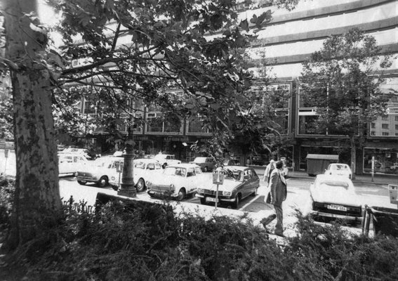 Ezt az utcasarkot sokan ismerhetik, számtalan bulizó sétált el előtte. A Ráday utcai kiülős-negyed kellős közepén vagyunk, ahol akkor még parkolhattak autók. Érdekes módon csak német gyártmányok vannak a képen, a népi demokratikus, meg a tényleg demokratikus Németországokból származó kocsik. A Trabik és a púpos Waresz mellett egy Bogár-utódnak szánt Typ3 látszik (hiába az igyekezet, a Bogár sok-sok évvel túlélte).