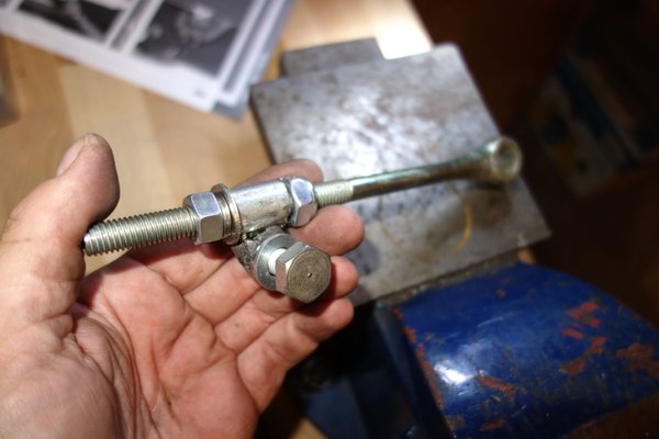 Simon Laci barátom sietett a segítségemre: adott egy vadiúj, rezgős felfogatáshoz való támasztópálcát. Ez voltaképpen egy spéci menetes szár, van benne egy dupla hajlítás, a végén egy illesztett szem, s az egészet alaposan megedzik. Az eredeti felállásban ez támasztja a generátort a felső fülénél, s az ezen levő menettel állítható az ékszíj feszessége is. Pillanatnyi elmezavaromban úgy döntöttem: amíg rá nem találok álmaim régi típusú generátorkonzoljára, addig a meglevő rendszert teszem hibriddé. Megmarad tehát a 123-as-féle állvány, de a felső pontján megtámogatom ezzel a 115-ösbe való rúddal, hogy le ne törjön.