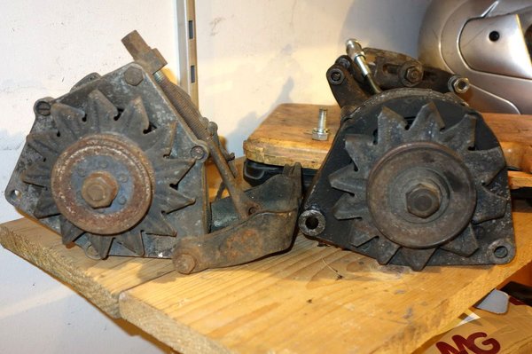Vakartam a fejem búbját – ami nekem amúgy könnyen megy – mi a fészkes fene legyen most. Az újfajta generátor felső rögzítése nagyon vastag, pedig a fülön hátulról el kell férnie a támasztópálcáról lelógó, állítható diónak is a régi felállás szerint. Mi több, az újban mindenütt 10-es csavarlyukak vannak, míg a régi 8-asokkal működik, ilyen a tartó is. Jó-jó ez a 123-as-féle, modernebb generátor, de annyi ponton más, mint ami az 1973 előtti állványba való, hogy reménytelennek tűnt berakni. És ott volt még az a cseppet sem lebecsülendő tény, hogy az autó teljes elektromos rendszere az újabbik fajtát fogadja, amit képtelen lettem volna záros időn belül visszaépíteni régire. Nem, maradok a jelenlegi generátornál, meg kell tartanom a 123-as fajtájút, arról amúgy is tudom, hogy legalább jól működik, s a konstrukció kevésbé problémás is.