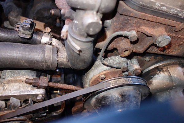 Végül átküldött neten egy képet, hogy megmutassa – igaz, az egy olyan blokkot mutatott, amin még nem volt fent az alsó ékszíjtárcsa vaskos, fokolós tömbje, amitől viszont az én blokkomon alig lehetett észrevenni. De így, hogy láttam miről beszél, már értettem, hol kellene tapogatózni. Meglett a lyuk, átmenetileg beletekertem egy 10-es csavart, ajjaj, szemre nagyon furán állt a pálca. Pedig így való az, csak olyan rég láttam, hogy teljesen kiesett a fejemből.