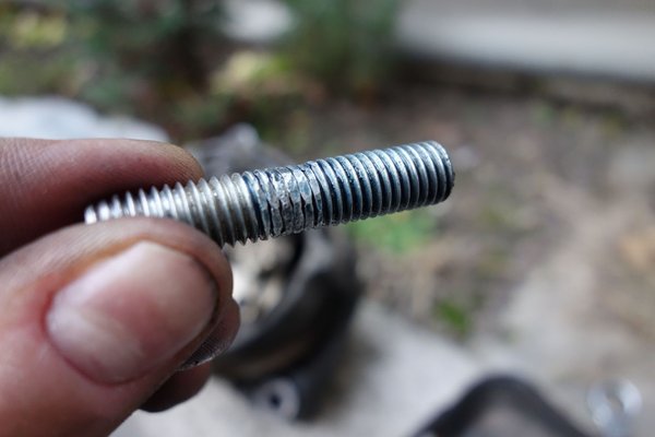 Először azért biztonságból vágtam tőcsavart a generátorállvány belső csavarjához is. Ez egy nyitott lyuk, tehát a tőcsavart be lehet tekerni annyira, hogy beesik a motorba, ezért középen elkalapáltam, hogy a végén ráhajtott anya ne csavarja túlságosan be. Menetrögzítőt is használtam, részben, hogy a csavar biztosan bent maradjon, részben pedig, hogy az olajszivárgásokat elkerüljem.