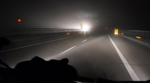 Éjfél elmúlt már, amikor aztán beütött a pokol. Az utolsó ötven kilométer a kocsányon lógó szemeké volt. Aki tolt már le 13 órát, az tudja, hogy a vaksötétben, az utolsó pici szakaszon, mennyire nem hiányzik már a totális tejköd, amikor effektíve az orrunkig látunk (a fényképezőgép képe csal, sokkal jobb a chip fényérzékenysége, mint a szemünké). Az eső vízszintesen szakad, úgyhogy a szellőztetés (márpedig friss oxigén kell) felér egy zuhannyal, plusz abszolút véletlenszerűen el-elhúzzák a sávot vagy éppen szűkítik és kilométereket kell megtennünk vakon, a két betonfal között úgy, hogy oldalankét harminc centi marad a tükrök mellett. Mindezt egy hétméteres trélerrel. Kifolyt a szemem, a negyvenes tábla egy vicc volt, hiszen még az a pár autó, amellyel találkoztunk is, hússzal cammogott, nem lehetett gyorsabban. Ott egy kicsit meghaltunk, még László is csendben nézte a betont maga előtt. Én pedig imádkoztam, hogy a pár centire elhúzó szembejövő, harminctonnás kamion sofőrje is legalább olyan éber legyen, mint én.