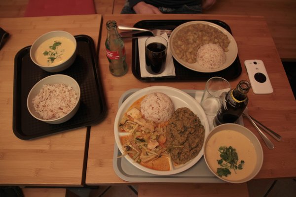 Kiadós séta után jutottunk a Tripadvisoron kinézett kis ázsiai büféhez. Örök hálával tartozom a Tripadvisornak és Dávidnak, mert lehet, magamtól sosem keveredtem volna ide. Nürnbergi kolbászt ettem volna, vagy szimplán beérem valami hamburgerrel, girosszal, de mivel Dávid nem eszik húst, érthető volt, hogy két napi vega-hamburgerezés után – igen, itt van bundában sült zöldséggel készült burger is – kívánt volna valami más rendes kaját. Ezért arra gondoltunk, keressünk egy indiait, mert az indiai éttermekben minden átkozottul finom, akár húsos, akár zöldséges, mindenki boldog lesz. És rátaláltunk erre a kis büfére, aminek barátságosak az árai, barátságosak a gazdái, és ahol bitang jót ettünk. Nekem az ilyen ázsiai kaja akár minden nap jöhetne. Persze csempésztünk a menüsorba egy kis helyi ízt is, muszáj volt igazi Afri-Colával öblíteni a spenótos lencsét, a vörös curry csirkét.