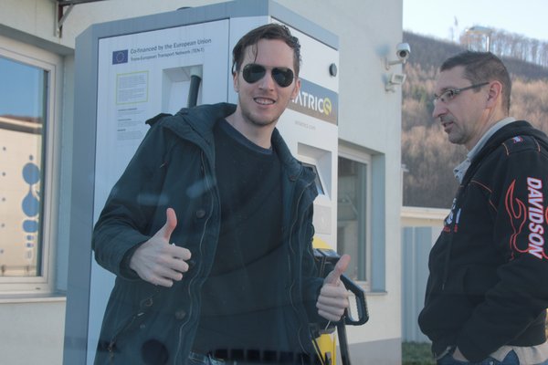 Amíg lassan csorgott a villany a Soulba, megkerestem a legközelebbi CHAdeMO oszlopot. A bécsi körgyűrűn, pontosan arra, amerre megyünk van egy, méghozzá 25 kilométerre a pozíciónktól. Mire a navi megtervezte az utat, már fel is töltött annyira az akksi, hogy kis ráhagyással elérjük az oszlopot. Ezek az osztrákok szörnyűek, itt már stresszelni sem tud az ember egy rendeset. Így nem fogja Balázs egykönnyen elengedni a használt Leaf-vásárlási terveit. Majd meglátjuk, mit mond a magyar szakasz után.