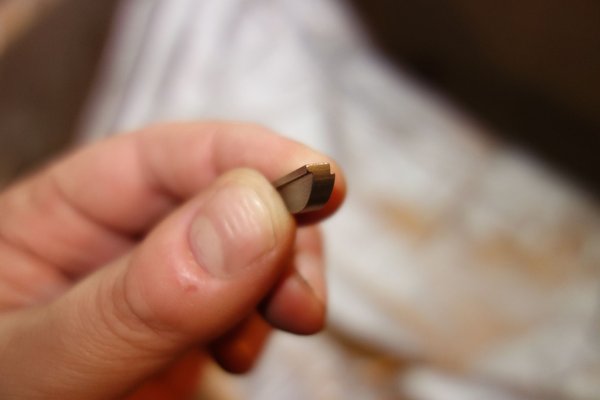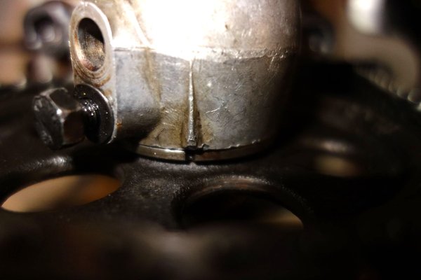 Szét az egész, finoman kiütögettem az éket (itt már nem olyan egyszerű, mert a lépcső feltámaszkodik a vezértengely anyagán, tehát ez nem akar kibillenni, a lépcső alá nyúlni viszont nem tudsz mivel, mert nagyon passzentos. Azért megkocogtattam, valami történt, mert a legvékonyabb csavarhúzómat már alá tudtam tolni, kiemeltem. Hogy ez micsoda förtelmes hulladékanyagból van... Finoman ütöttem (az eredeti éket sokkal erősebben), de így is benyomódott, oldalt meg kitüremkedett ugyanazon a helyen. Bepróbáltam a lánckerék hornyába, naná, hogy elakadt. Oké, tűreszelő elő, lehúztam róla az egyenetlenséget. Akkor most össze, de fordított ékállással.