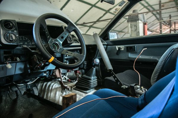 Nos, nem így volt, sok szenvedés, küszködés, kormányagy- és közdarab legyártása után jutottunk el egy mélyagyas Renault kormányig (Bandi túrta valahonnan), amely már jó távolságba került mindkettőnknek, viszont akkora átmérője volt, mint egy hadronütköztetőnek, nem egyszer tépte le a bőrt az ujjainkról és a kézfejünkről az ajtólemez éles pereme, annyira közel került. Így nem maradhatott, szerencsénkre BP Racing Palinak akadt némi elfekvő, küllemhibás, mélyagyas kormánya, így azt megkaptuk, a hozzá való aggyal már szinte jók voltunk. De csak szinte, mert ha rendesen beültünk, akkor túl hátradőlve ültünk, nyújtott karral pedig ezt csinálni nem lehet. Ezért akarva-akaratlanul is mindig meglazítottuk magunkon az övet, ami nem túl okos dolog.