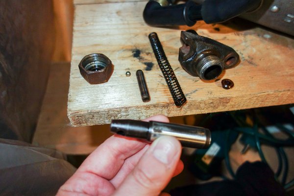 No igen, gyanús volt nekem az az olajos láncfeszítő már rég. Két csavar kiszedni (meg kicsit matatni kell a lánccal), kézbe vettem megint. Amióta utoljára találkoztunk, így, kéz a kézben, lett jobb, amerikai kiadású könyvem, most jobban láttam, hogy áll össze belül. Aha, fordítva volt bent a golyós szelep üléke. Lötyög is benne a golyó, mit vártam, hiszen műanyag és 54 éves. Oké, akkor keressünk másikat a neten.