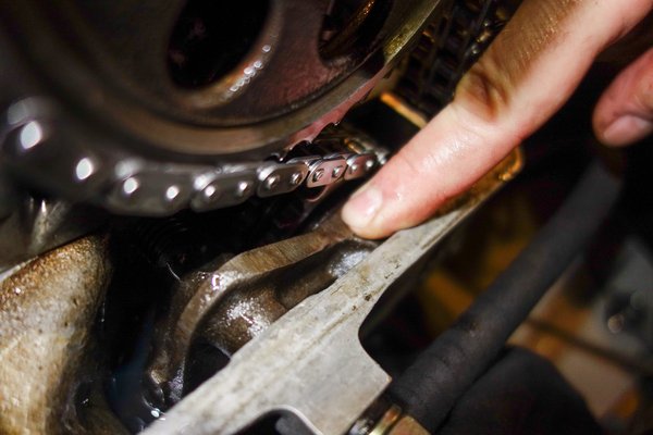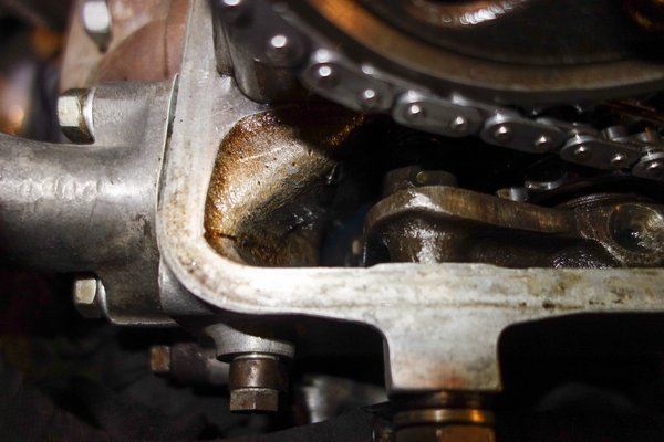 Oldalt van egy kis tálka a hengerfej öntvényében, oda kell önteni az olajat, a feszítő innen kapja az utánpótlást, ha szomjazik. Miközben nyomod az olajozót, a feszítő lánckerék felőli végét a másik kezeddel nyomkodod lefelé, éppúgy, mint légtelenítéskor a féket. Sok-sok toszogatás után eljön a pillanat, amikor úgy felkeményedik, hogy nem lehet lenyomni többé. Hogy biztosra menjek, most még löktem rajta tízet, olyan lett, mintha odaöntötték volna fixre a stuttgarti kohóban, '62 januárjában. Láncot visszatekertem, befeszült az egész, szelepfedél vissza, indíthattam.