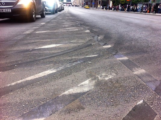 Az a baj ugyanis, hogy az aszfaltra felhordott gumicsík szárazon ugyan tapad, de esőben csúszhat, mint a szappanos takony. Én csak tudom, volt olyan hungaroringi pályanapom, amikor a szalagkorlát fogott meg, mert nem voltam tisztában vele, hogy a versenyhétvégén felgumizott pályán a szemerkélő esőben még egész jól lehetett menni, de ahogy egybefüggően vizes lett az aszfalt, úgy elkezdett csúszni, mint a ledöngölt hó. Most, hogy pont a Frenciek terének viszonylag új zebrájához telepített lámpa előtt vastagon fel van gumizva az úttest, egy esős napon egy hirtelen fékezéssel elkerülhető baleset jó eséllyel nem lesz elkerülhető. Vagy esetleg éppen egy nagyobb lassítás miatt fog eltaknyolni egy motoros vagy robogós.