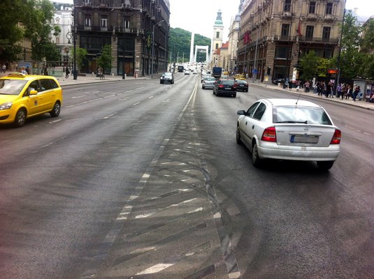 A terelővonalakra, buszsáv-felfestésre és a forgalom elől elzárt területet jelölő útburkolati jelekre felkent fekete gumi nemcsak csúszhat, de a felezővonalat a fekete csíkok megszaggatják, egyes jeleket láthatatlanná, értelmezhetetlenné teszik, esetleg valaki félreértelmezi a víztől csillogó úttesten (nem)látható jelzéseket – hasonlóból történt már sok baleset és majdnem-baleset. Csak remélni tudom, hogy az illetékes szakemberek még azelőtt gatyába rázzák a Ferenciek terének felfestéseit, hogy valami baj történne. Meg aztán, ha már olyan sok pénzből ilyen szépen kicsinosították a területet, ne nézzen már ki Budapest belvárosának közepének egyik legforgalmasabb, frissen felújított útszakasza, mint a város szinte bármelyik területe.
