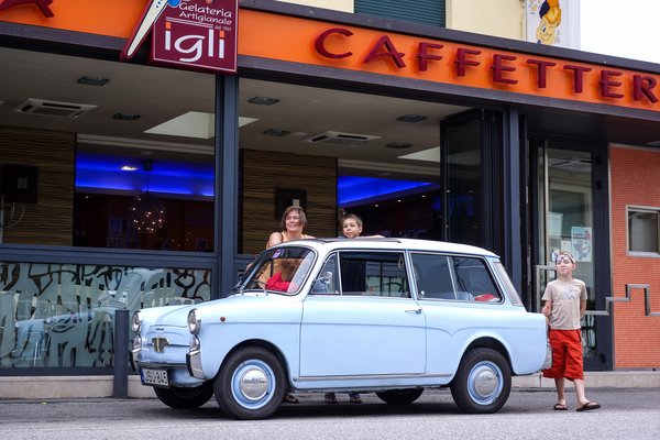 Annyira szerettem volna ezt az utat, hogy tavaly még azt is megnéztem, mennyibe kerülne esetleg 500-as Fiatot bérelni ott, de az tényleg horror. És az a bökkenő, hogy egy Fiat 500-ba tényleg nem férünk bele, mert az hátul már nem Bálint-kompatibilis, ő ugyanis időközben már majdnem 170 centinél tart. A Bianchi ezért is eszeveszett jó: bár teljesen 500-as Fiat-hangulata van, a plusz tengelytáv és az egyenes tető miatt akkora belül, hogy ha kell, rövid távon négy felnőtt ember is belefér, ezt anno kipróbáltuk egy sukorói Belsőség-talin. És ebben van elöl is kicsi, hátul meg közepes csomagtartó, amivel egy szedán 500-as álmában sem tud versenyezni. Tehát vagy a Bianchi, vagy semmi.