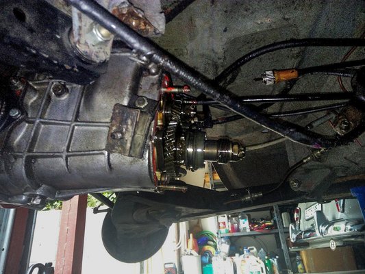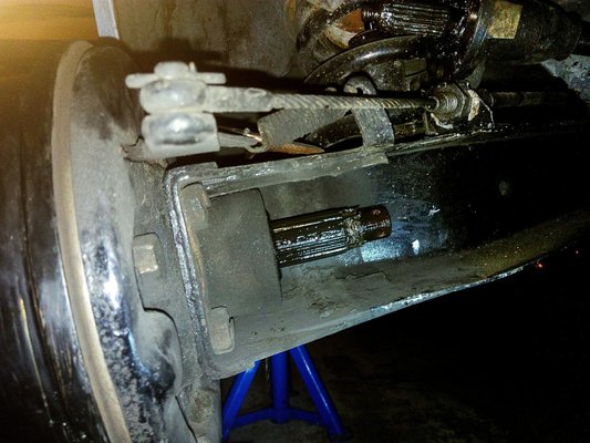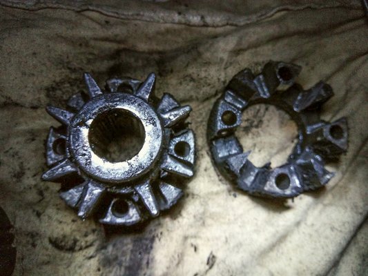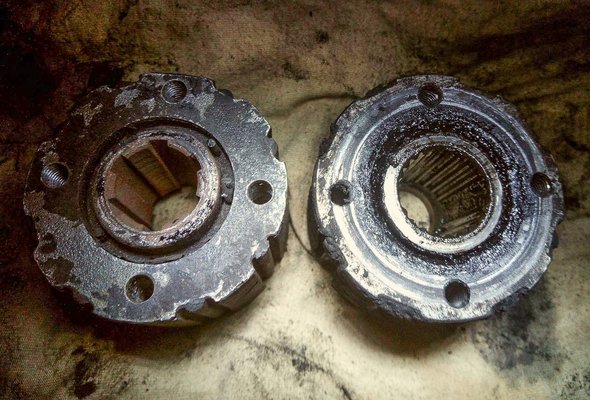 Ha már bakon volt, megnéztem, mi lóghat a hajtásban. Amitől féltem: a Hardyk. Totál szétment bennük a gumitöltet, sőt, már a külső részük fémje is alaposan elfogyott. Itt vagy 15 fokot el tudnak fordulni a féltengelyek, szorozd meg ezt két oldallal, az már összesen majdnem 30 fok. Az sok, ráadásul nincs gumicsillapítás sem, ezért már fém a fémen veri szét magát régóta. Tavalyelőtt már a két tartalék bontott elemem közül a jobbikat feltettem, mert a kocsi egyik sajátja eltört, de most megint a határán van minden. Új kell belőlük, nem lehet tovább húzni.
