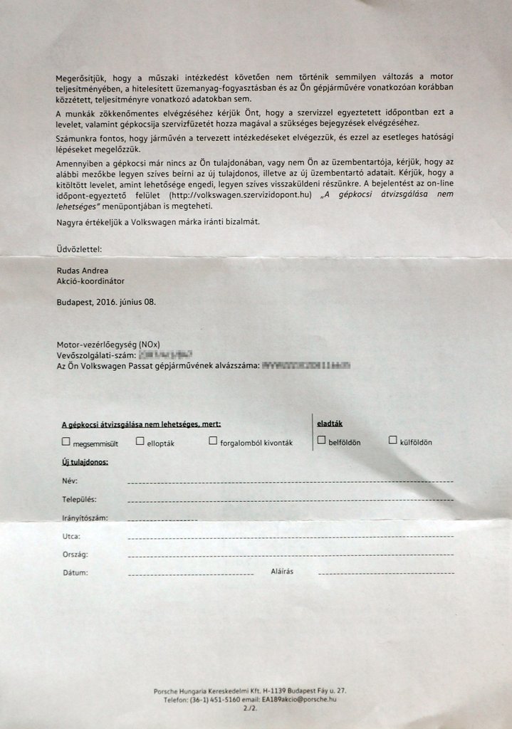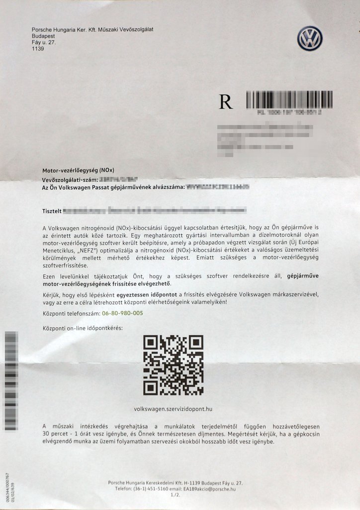 Jól eltettem a levelet, mert volt egy előérzetem, itthon másképp fogják kezelni a problémát. Lehet, hogy nálunk is mentek ki az év első felében értesítések, de ezek hozzánk nem jutottak el. Mostanáig kellett várni, hogy kezünk közé kerüljön az első hivatalos levél, amelyben egy Passat-tulajdonost tájékoztatnak arról, hogy a frissítés már elvégezhető.