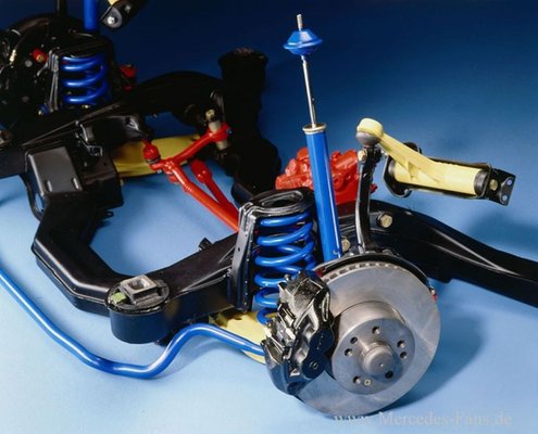 Hátul maradt az oldalanként egy-egy brutális ferde háromszöglengőkarral megvalósított független rugózás, elöl és hátul masszív bölcsőn lakott minden mechanikai egység, a karosszériától alaposan elválasztva mindenféle vastag gumibakokkal. A csend és finomság alapáras volt még a legtraktorosabb négyhengeres dízelekben is, akárcsak a négytárcsás fékrendszer – de hiszen az már akkor régen úgy volt minden Mercedesben.