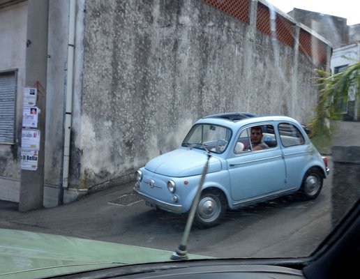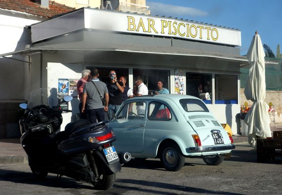 Naja, az eredeti Fiat 500. Valószínűleg sehol, még Olaszország szárazföldi testén sem akkora ezeknek az autóknak a sűrűsége, mint itt. Északabbra már láthatóan divatautóként, veterán járműként, életstílus-kiegészítőként használják a jobbára felújított Cinquéket, de itt ezek még horpadtan, szakadtan, lógó elemekkel, foltosra mattulva igazi autóként húzzák a belüket – pedig a legfiatalabb is 42 éves közülük. Persze akadnak gyönyörűre restaurált darabok, tuningolt kocsikat is látni, de nem ezek adják az 500-as szcéna gerincét. Fotóztam egy csomót mindenféle helyzetben, színben, érdemes belekattintani a 41 képes galériába, mert csodás helyeken és állapotokban lehet megfigyelni ezeket a kis járműveket, igazi közegükben.