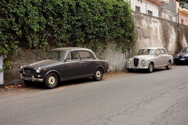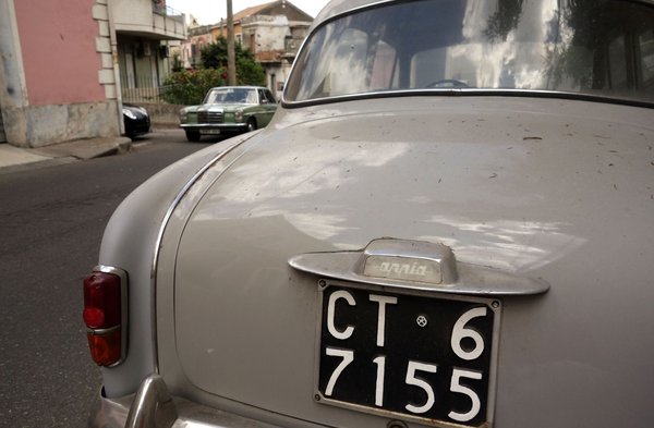 A legnagyobb veterános fogásom két Lancia Appia volt az Etnára autózás közben, egy kisvárosban. A két kocsi – egyik egy korai szériás, másik egy későbbi – láthatóan régen porosodik az utcán, de a koszt leszámítva szép állapotúak, rozsdamentesek, a belsejük intakt, s még rajtuk van a csodás, elöl pici, hátul négyzet, régi olasz rendszám is – cataniai ráadásul.