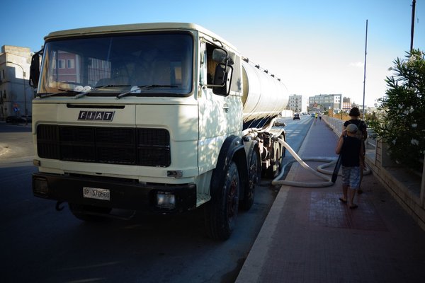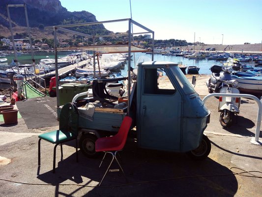 Piaggio Apék a hatvanas évektől a legújabbakig vasvillán hányható mennyiségben vannak jelen, fel is tartják a forgalmat rendesen. De a teherautókínálat csúcsa nekem még az Iveco előtti korszakból származó, nagy, szivattyús Fiat-teherautó volt. Hogy ezek mennyire jól néztek ki, azzal a hatalmas, paralelogrammás emblémával az orrukon... Azt ugye tudják, hogy egy nagyjából minimum negyvenéves teherkocsi ez, napi szolgálatban? A hely Trapani, épp egy strand ciszternáját ürítik vele. Vagy valami hasonló.