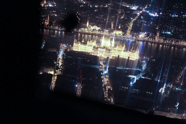 Szálltam én már fel is, meg le is Ferihegyen sötétben, de egy modern utasszállító közel kétszeres sebességgel ugrik fel a betonról, és folyamatosan gyorsulva igyekszik elérni az irányítók által megadott repülési magasságot. Valamennyit ugyan látni a városból így is, de pillanatok alatt eltűnik Budapest az ablakokból. Itt viszont minden lassított felvételen pörög, ráadásul a belváros felett húzunk el.