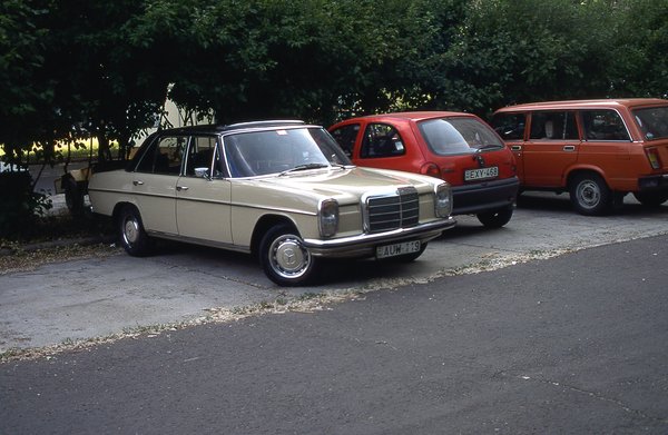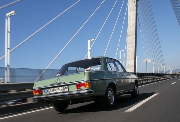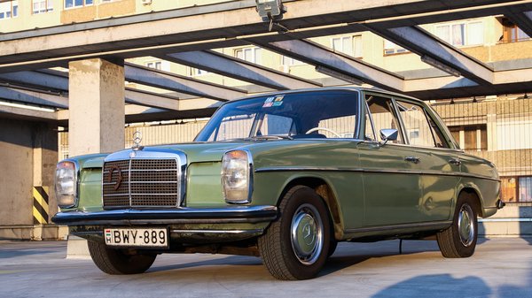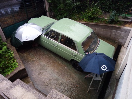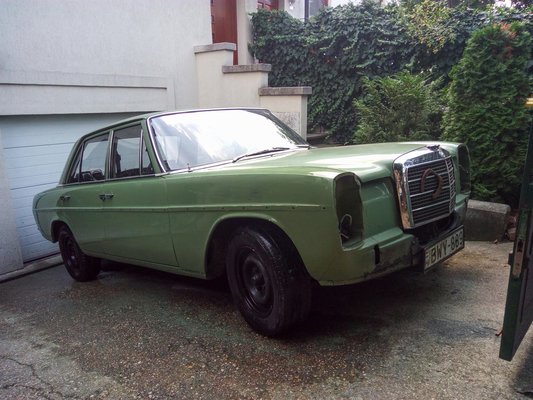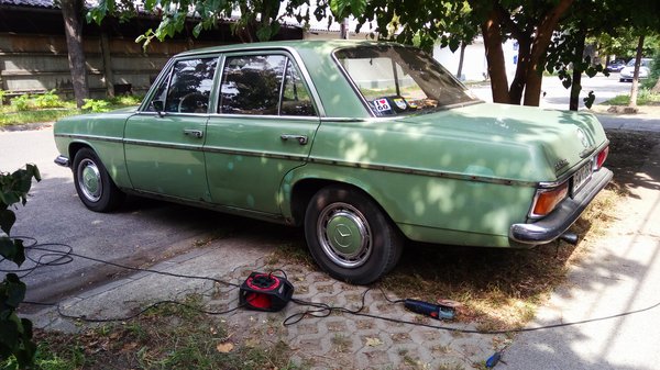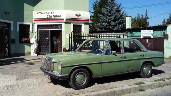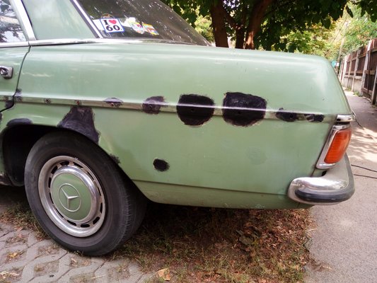Garázsba nem akartam tenni, mert azokat a helyeket nála értékesebb és sérülékenyebb projektek foglalják, viszont nem tudtam elképzelni az életet járós W115-ös Mercedes nélkül – imádom a hangulatát, a kényelmét, a mozgását, azt, hogy keveset eszik és mindig működik, hogy tényleg nemigen jön szembe másik az utcán, hogy napokig grasszálhatok a városban, s nem találkozom nála öregebb autóval. Egyetlenegy lyukkal vettem az autót – a bal oldali küszöb végénél van egy apró kis epoxis javítás azóta is -, s egyetlen másik lyuk keletkezett csak rajta öt év alatt, az is a jobb első taposó, a hossztartó mellett. A hossztartó hibátlan, korróziómentes maradt, mellette viszont a Mike Sandershez nem jutó lemez elrozsdásodott. Azt kilakatoltam még augusztusban, de már írtam is róla, nem ismétlem meg. Egy folt kellett oda, oszt csá.