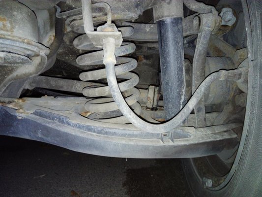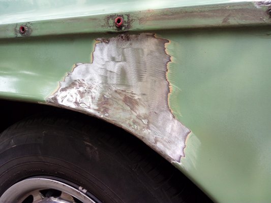 Az első felfedezés, amit tettem azon a bizonyos első vasárnap: Foltos ugyan pocsékul nézett ki, pláne közelről, pláne sallangok nélkül, de a csiszológép minimális munkája után sehol nem találtam lukat, sőt, ahol a rozsda láthatóan bele is mart a fémlemezbe (bal első ajtó alja, díszlécpatentek környéke), még ott is masszív, erős a lemez. Amitől nagyon féltem, mert csúnya állólámpás-Merci rozsdagóc, az a rész, ahol az első sárvédő lent, a kerék mögött oda van csavarozva a karosszériához. Ott összegyűlik a sár belülről, dunsztolódik a lemez, dolgozik a helyi galvánelem, s ez a csücsök brutálisan elrohad. De itt nem. Felületi rozsda ugyan volt rajta, elég sok, de némi drótkorongozás után fémtiszta és ép pléhvel álltam szemben. Jó kis autó vagy, Foltos, nem is gondoltam volna, hogy ennyire.