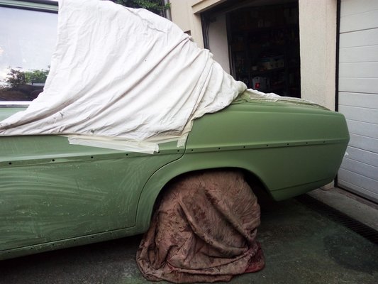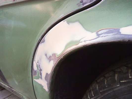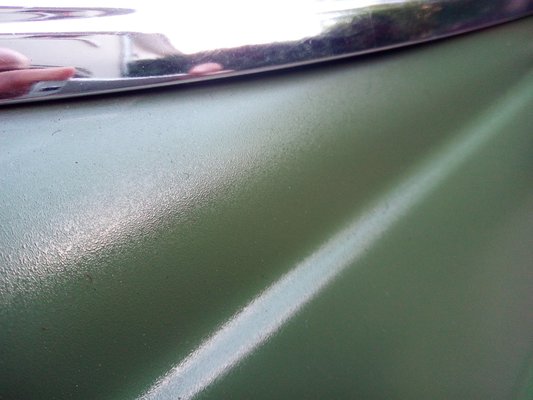 Van elcsiszolt él így is, de azokat óvatosan lefújtam színtelen lakkal, hogy egy kis esztétikai romlásért cserébe (valamennyi) korróziós tartósságot biztosítsak a lemeznek. Akadnak apró, sötétebb zöld foltok, amik még egy korábbi festés nyomai, de nem mertem jobban visszacsiszolni a festéket. A bal hátsó ajtón nem javítottam ki két húzásnyomot, a bajuszdíszlécek körül, az első lökhárítók mellett pedig – mivel ezek a kocsi elején vannak, s ott nem fújtam – kilátszik a fekete alapozó.