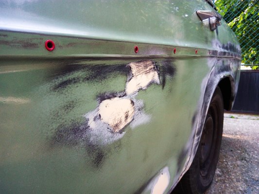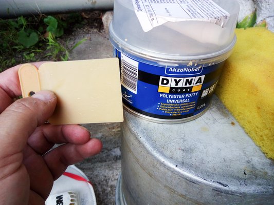 Repült a lelkem, könnyen és gyorsan haladtam, délutánra már túl voltam a korantos lemezpassziváláson/alapozáson, s felkentem az első adag kittet is a lemezekre. Erre ugye, azért van szükség, mert ahol az ember lecsiszolja a látható vastagságú festéket, pláne pedig ha még ragyás is ott a lemez, akkor valamivel fel kell hozni az autó síkjába a kialakult mélyedést. Ezt végzi el a kétkomponensű autókitt, ami olyan, mint a gyurma, csakhogy a belekevert edzőanyag miatt pár perc után kikeményedik és csiszolhatóvá válik. Néha túl gyorsan is, hogy száradna rá az ég.