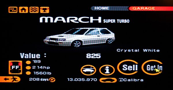 Szinte könny szökik szemembe, amikor végigpörgetem a garázsban évek óta türelmesen várakozó, 70 autómat. Te jó ég, itt egy Micra Super Turbo, a kedvenc fekete Skyline R34 GT-R-em, a csodás hangú DTM Calibra és végül elérek az Escudóhoz. Igen, az Escudo Pikes Peak, a játék egyértelmű aduásza: majdnem 1000 lóerő, kevesebb, mint 900 kiló és összkerekes. Nulláról százra 1,7 másodperc a rekordom vele, de viszonylag fixen tudta a 2 másodperc körülit mindig. Ez volt az az autó, amivel szinte lehetetlen volt direkt baromkodás nélkül versenyt bukni.