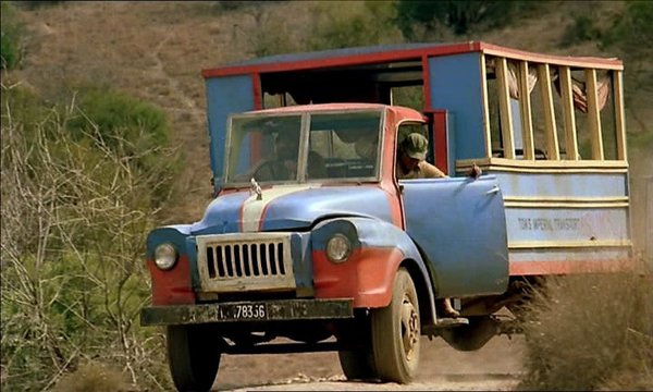 Egészen furcsa, piros-kék autó tűnik fel Afrika tájain – Tom ezzel szállítja szafarira a turistákat. A jobbkormányos jármű egy Bedford TJ J2-es, igen viharvert állapotban, kimondottan a vadászathoz alkalmas felépítménnyel.