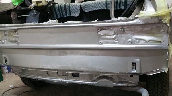 Jobb utastéri padló kilakatolva, két hátsó zseb kilakatolva, hátfal kilakatolva, hátsó kötény kilakatolva, négy szilent cserélve, kerékőrök kivéve, szigetelés berakva, Csaba még szigetelte, le is fújkálta a cuccokat emitt alvázvédővel, amott kikevertetett festékkel, bár szabadkozott, hogy ehhez tényleg nem ért. Nem is lett szép, de a célnak megfelel, tényleg nem is akartam jobbat most. Még arra is talált időt, hogy a beáramló nedvesség miatt erősen korrodált hátsó lámpatest-érintkezőket rendbe tegye. Ezek után csak a 30 ezres anyagárat akarta elfogadni...